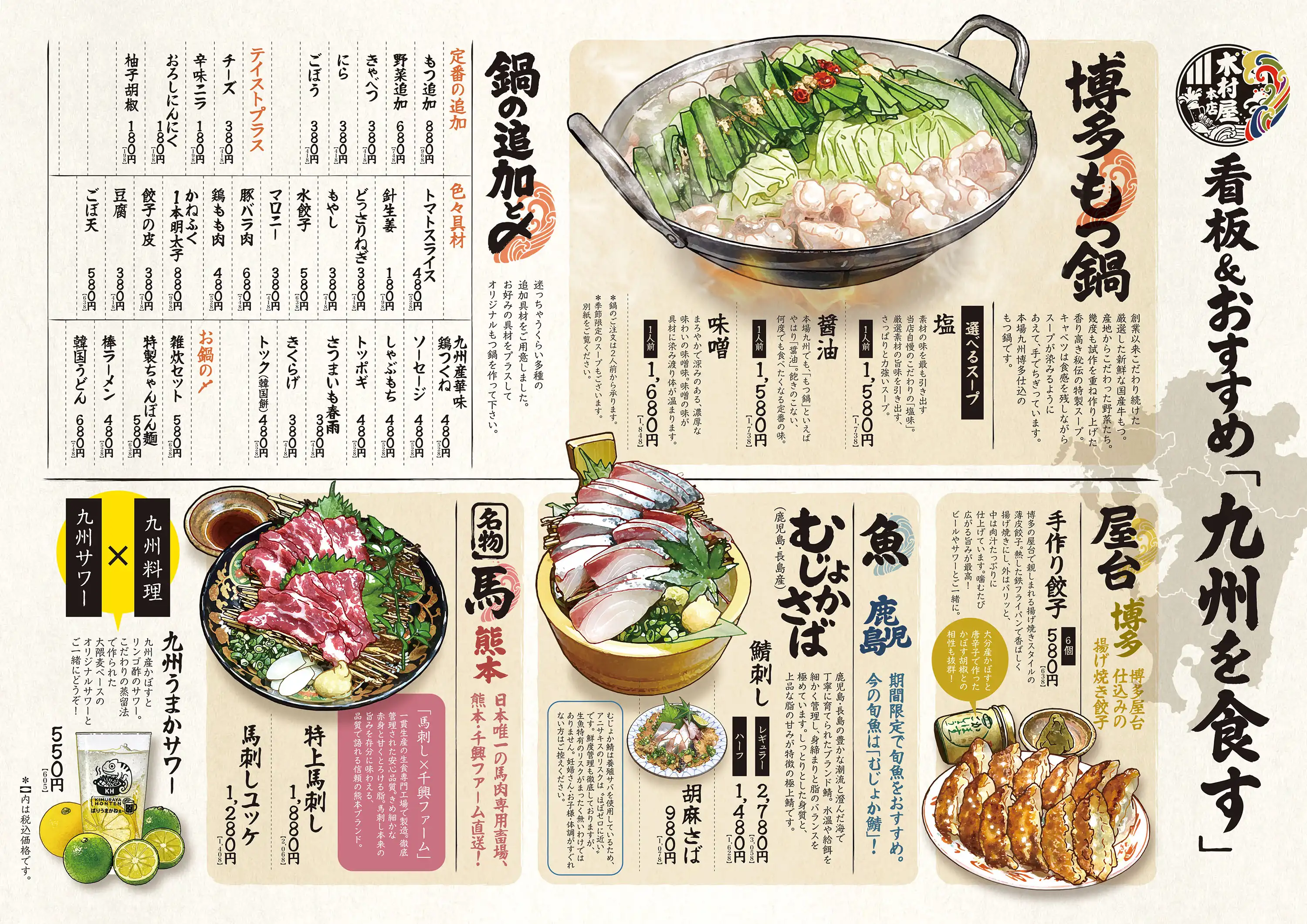 九州料理専門店の木村屋では、本場九州から直送された新鮮な食材をご提供しております。熊本直送の鮮馬刺しは、柔らかく上品な甘さを堪能できます!赤身、中落ちカルビ・たてがみ・ふたえご、その他多数ご用意!鮮魚も直送!単品から盛り合わせまでどのシーンにも合うよう様に多数ご用意♪